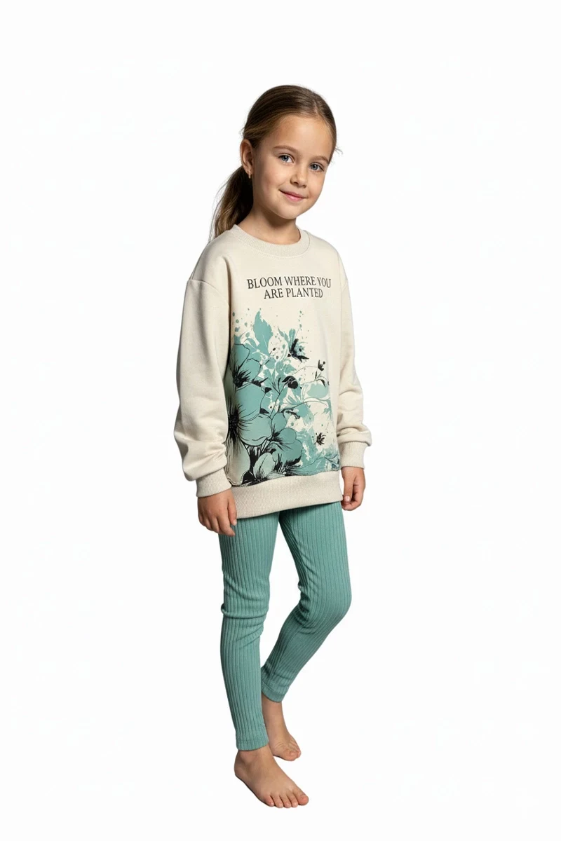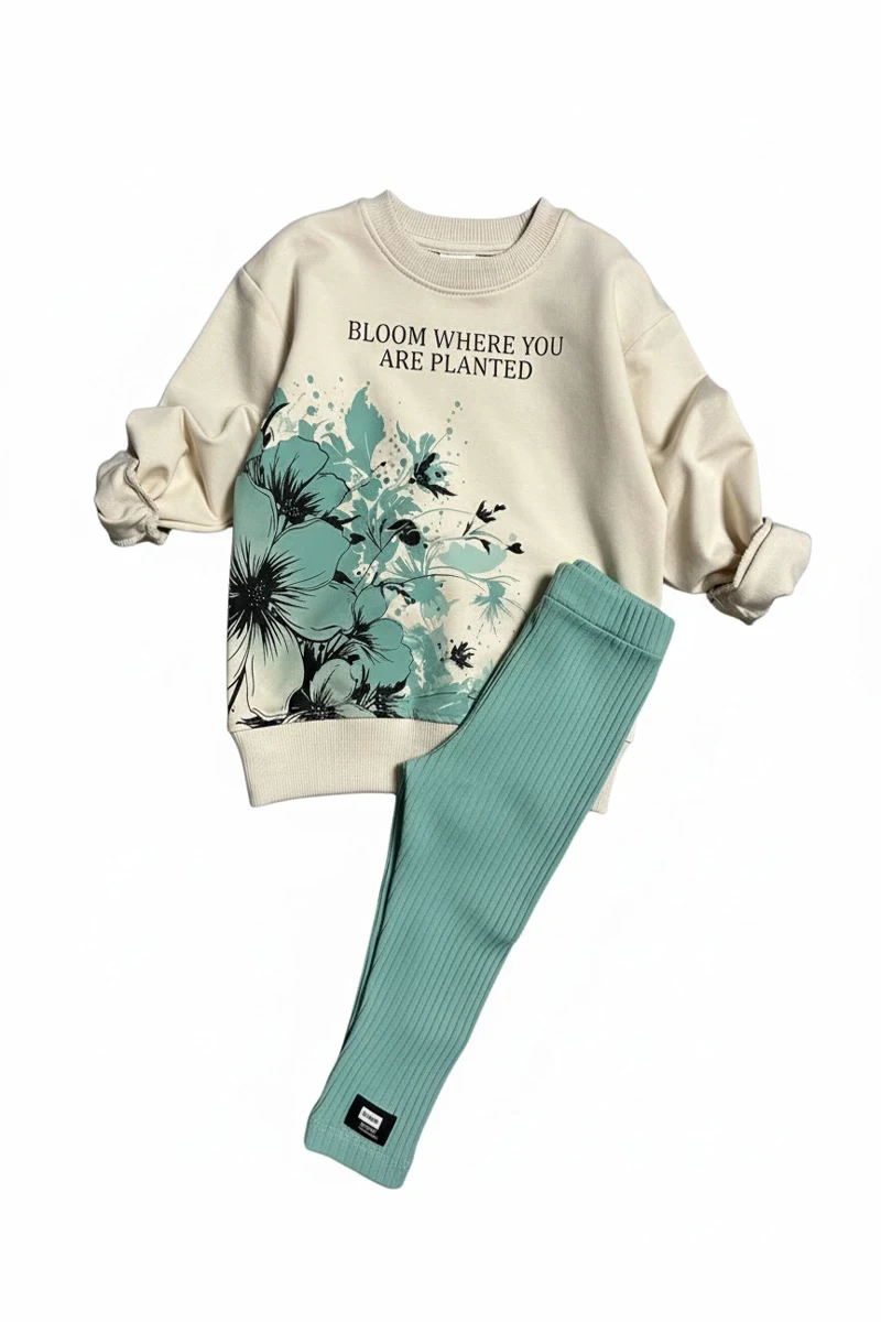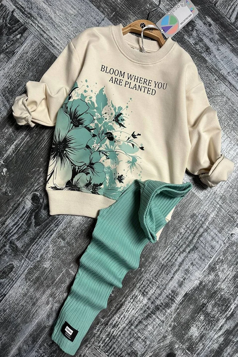 Yeşil Renk Çiçek Deseniyle Modern Bir Görünüm Sağlayan Üst Sweatshirt, Fitilli Kumaş Yeşil Renk Taytı ile Mükemmel Bir Uyum Yakalıyor.Yumuşak Dokusu Sayesinde Gün Boyu Rahat Kullanım İmkanı Sunarken, Esnek Yapısı Çocuğunuzun Hareket Özgürlüğünü Kısıtlamaz.Hem Günlük Kullanımda Hem Özel Günlerde Tercih Edebileceğiniz Bu Takım,Miniklerin Enerjik Ruhuna Renk Katıyor.