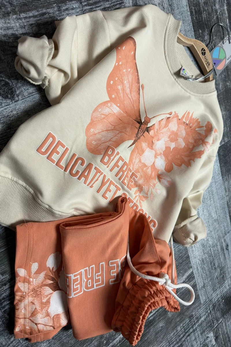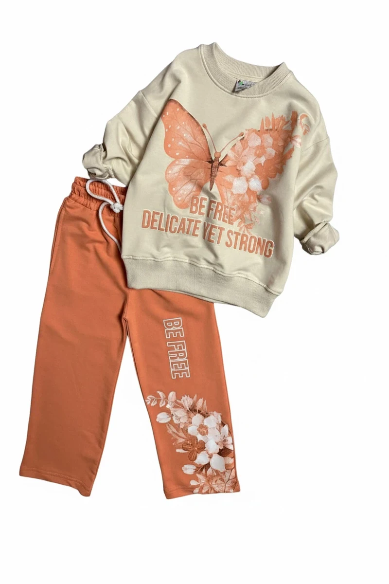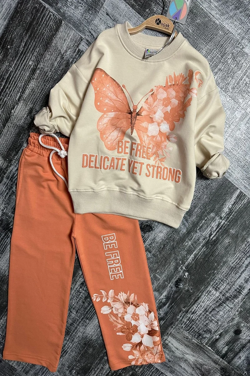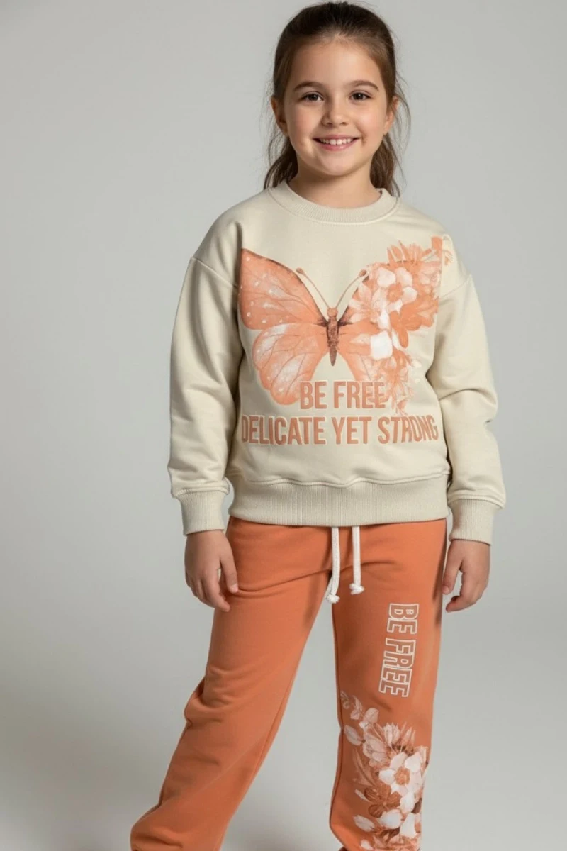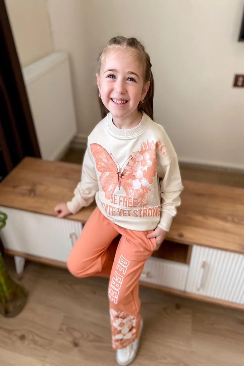 Kız Çocukları İçin Hem Şık Hem Rahat Bir Seçenek Arıyorsanız, Kelebek Desenli Turuncu Renk İki İplik Bol Paça Takım Tam Size Göre!