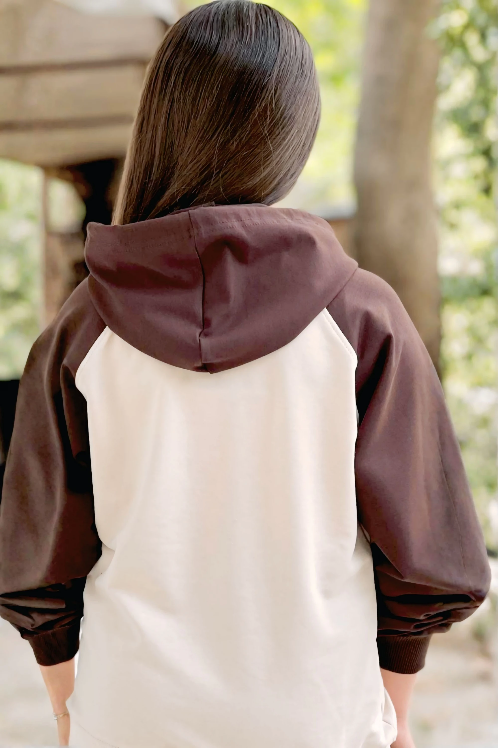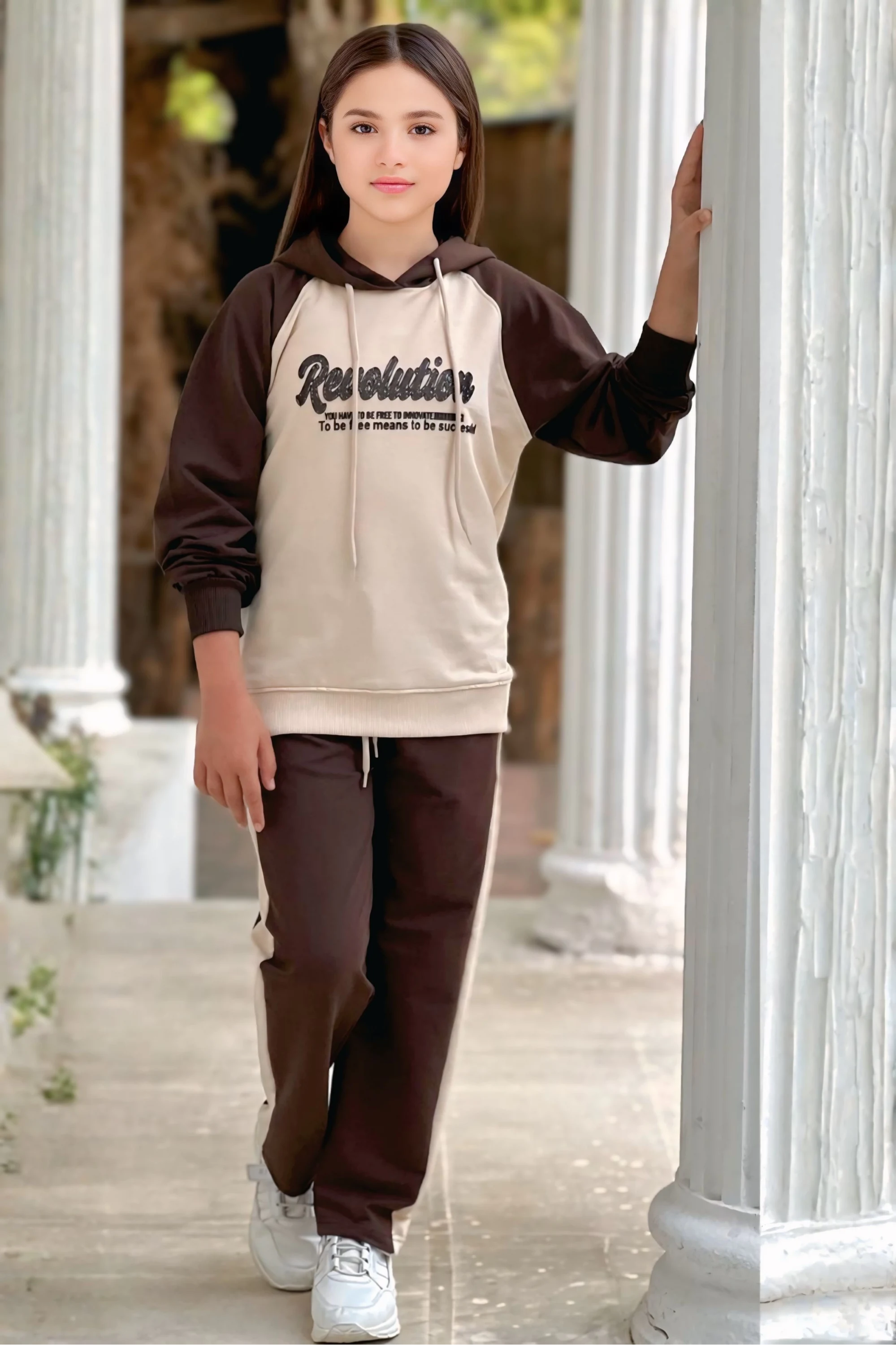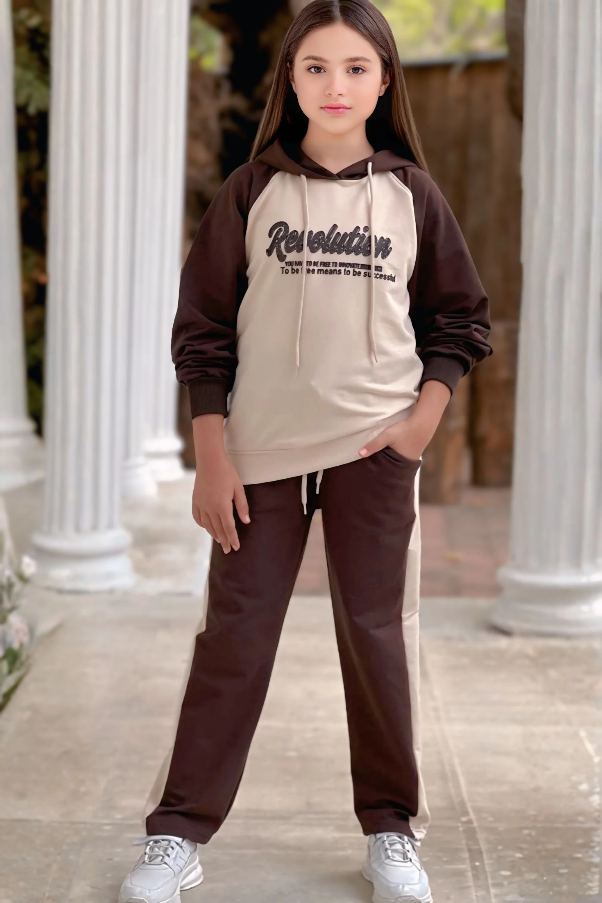 Bu Yazı Desenli Kapşonlu Kahverengi Kız Çocuk Eşofman Takımı Yumuşak Yapısı ve Modern Tasarımıyla Günlük Kullanım İçin Mükemmel Bir Seçimdir.